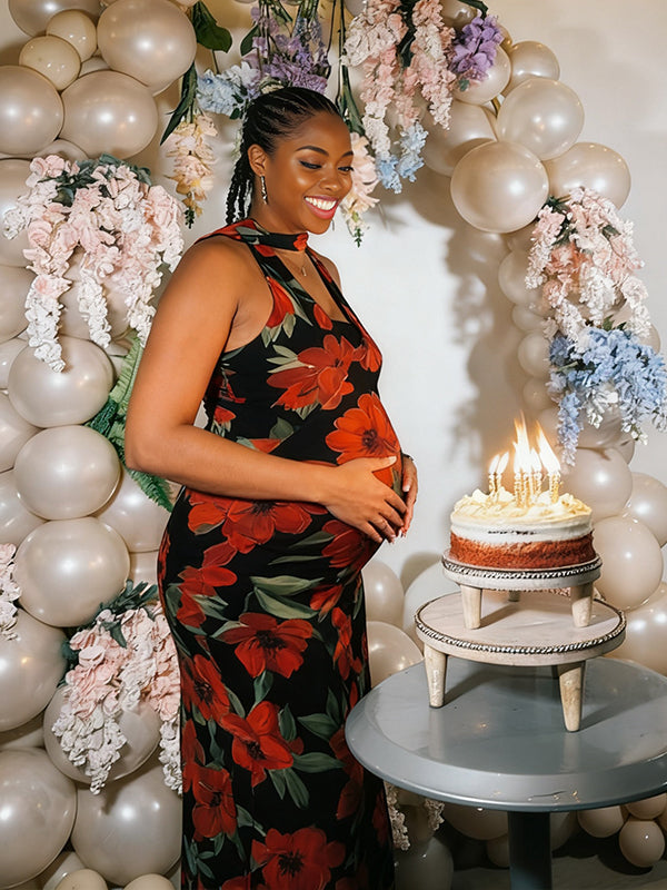 Momyknows Black Halter Neck Print Scarf Maternity Baby Shower Maxi Dress