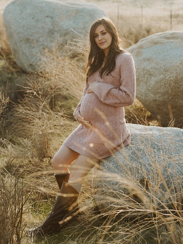 Momyknows Cable Knit A-line V-neck Lantern Sleeve Maternity Sweater Mini Dress