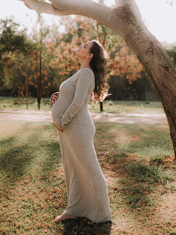 Momyknows Beige Knit Photoshoot Maternity Maxi Dress