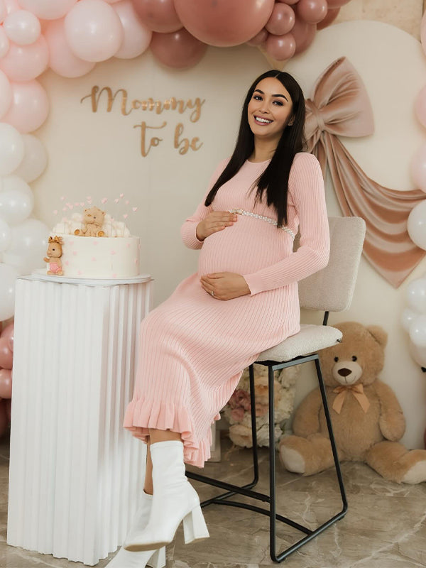 Momyknows Pink Ruffle Baby Girl Shower Maternity Maxi Sweater Dress