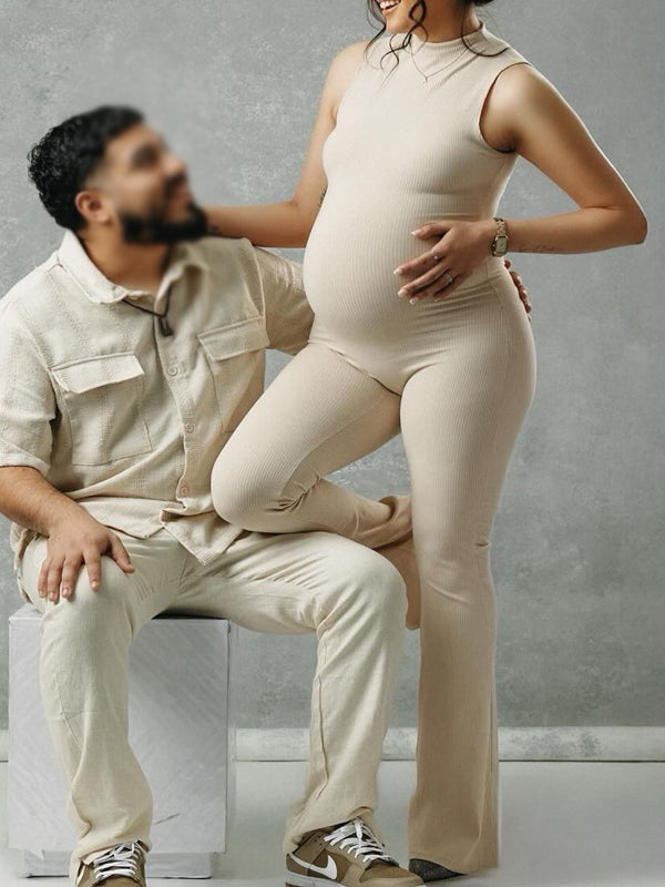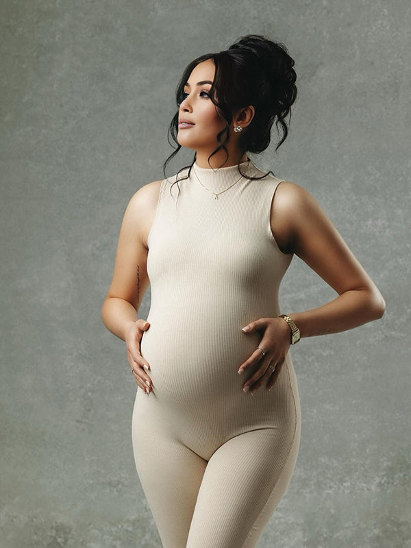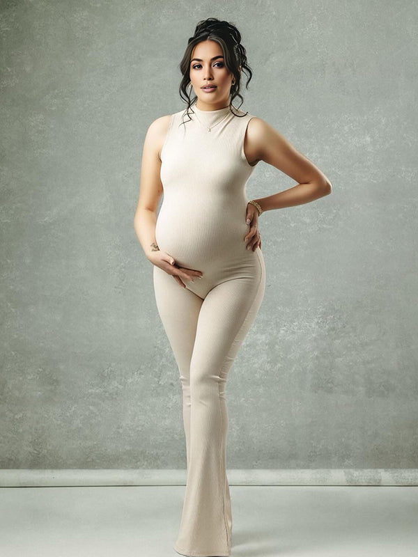 Momyknows Apricot Half-turtle Neck Zipper Crochet Maternity Photoshoot Jumpsuits