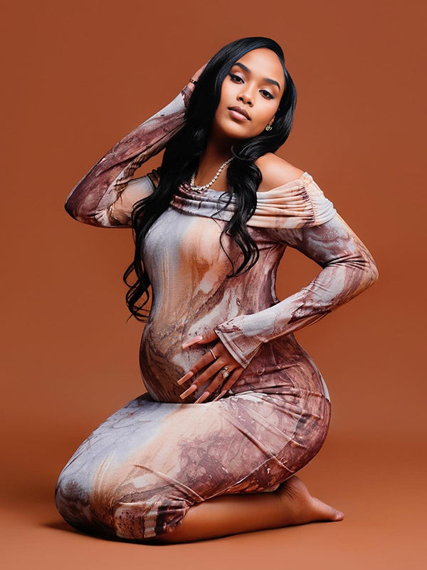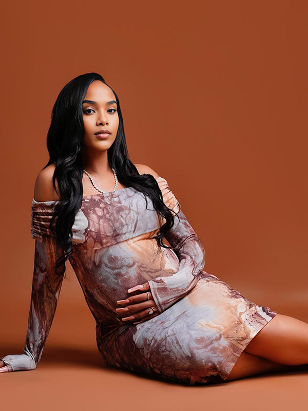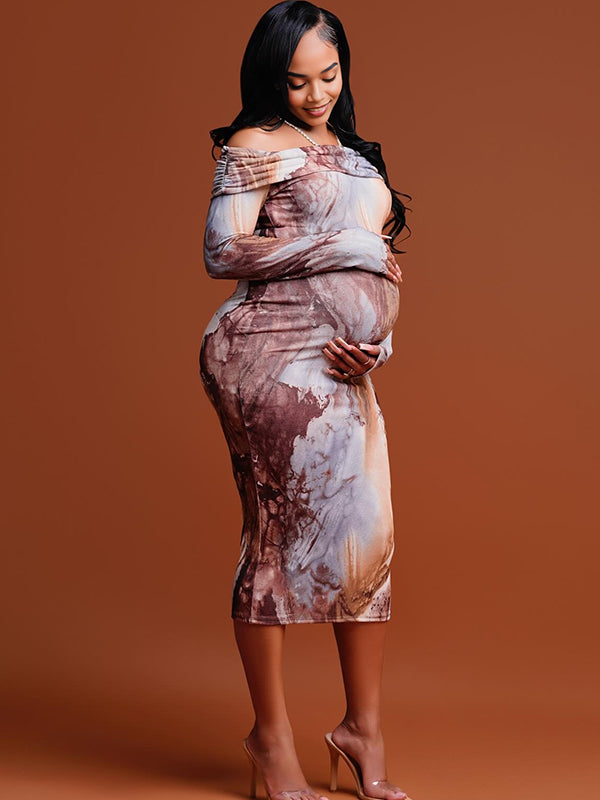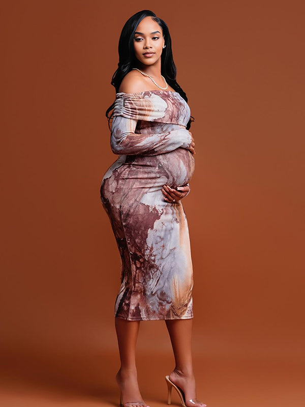 Momyknows Brown Print Off Shoulder Bodycon Maternity Photoshoot Midi Dress