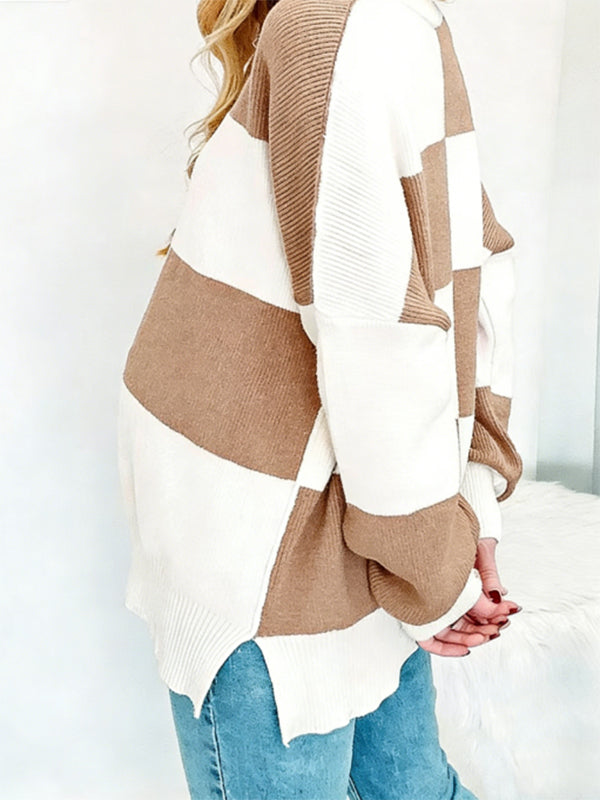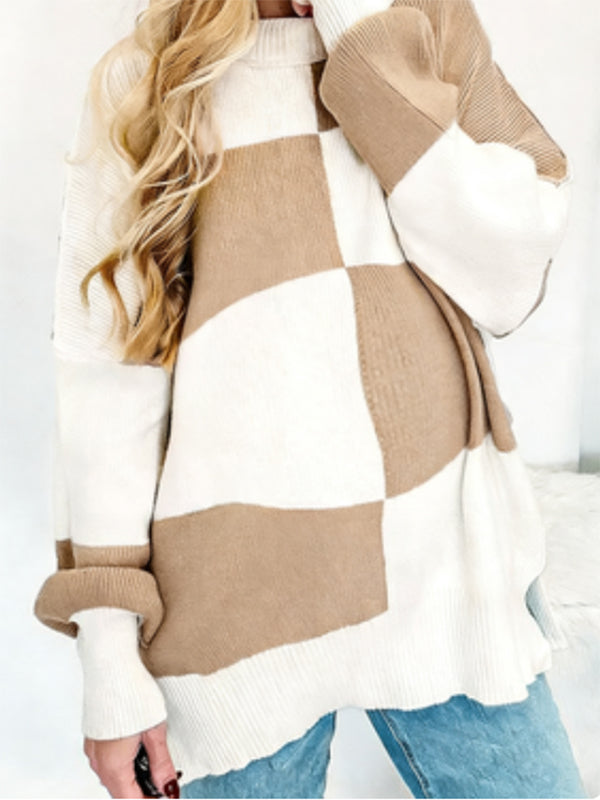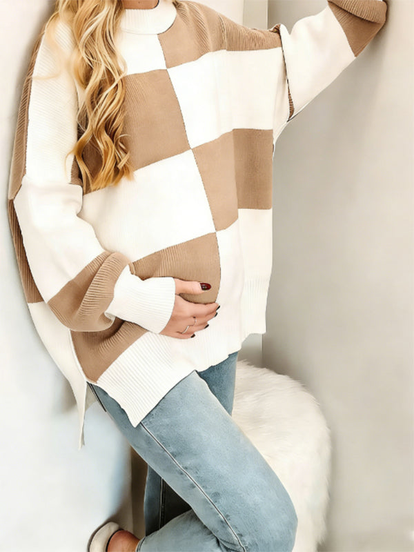 Momyknows Khaki Crochet Damier Hit Color Spliced Maternity Sweater Photoshoot Top