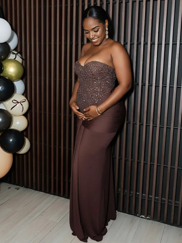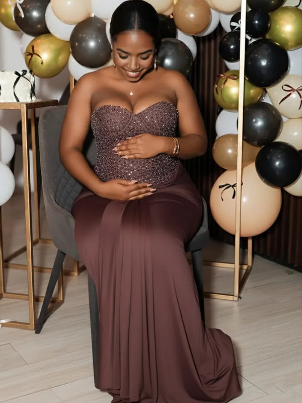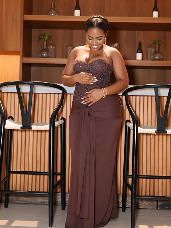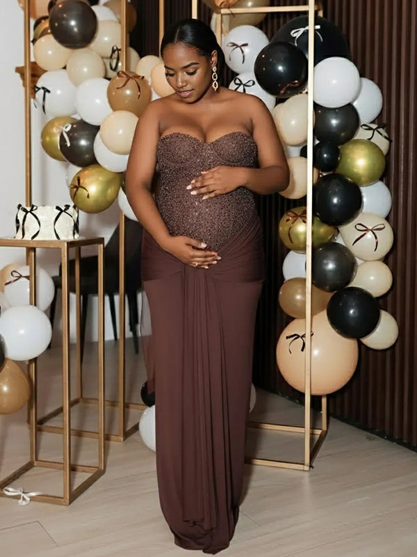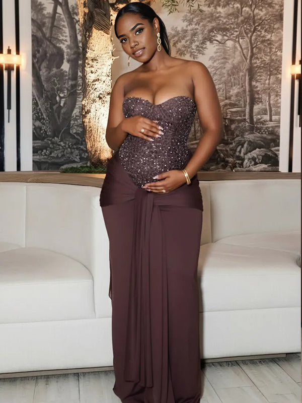 Momyknows Sequin Bandeau Ruched Knot Draped Bodycon Maternity Maxi Dress
