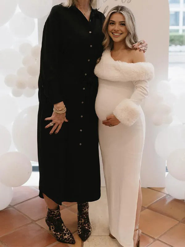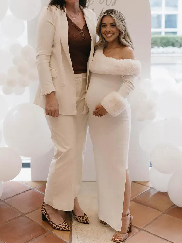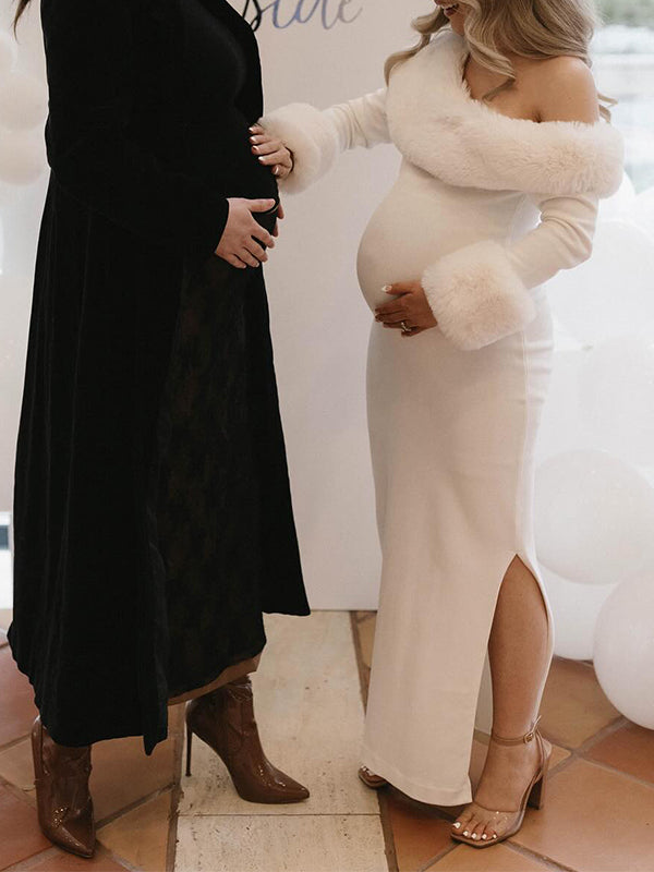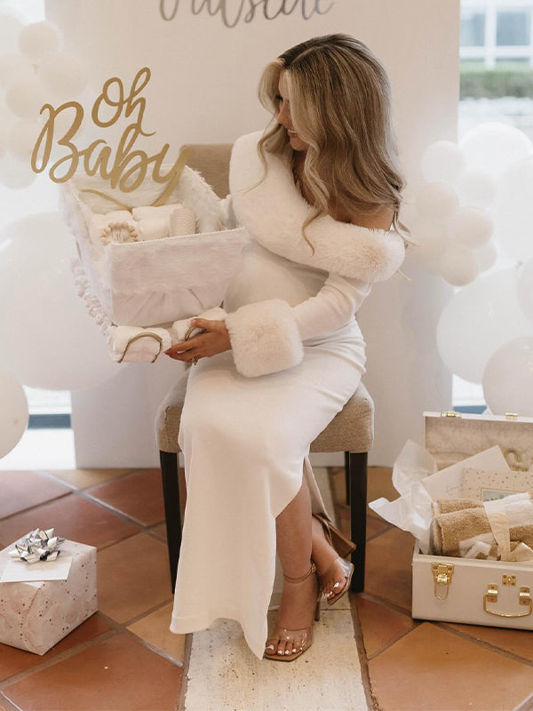 Momyknows White One Shoulder Feather Side Slit Baby Shower Maternity Maxi Dress