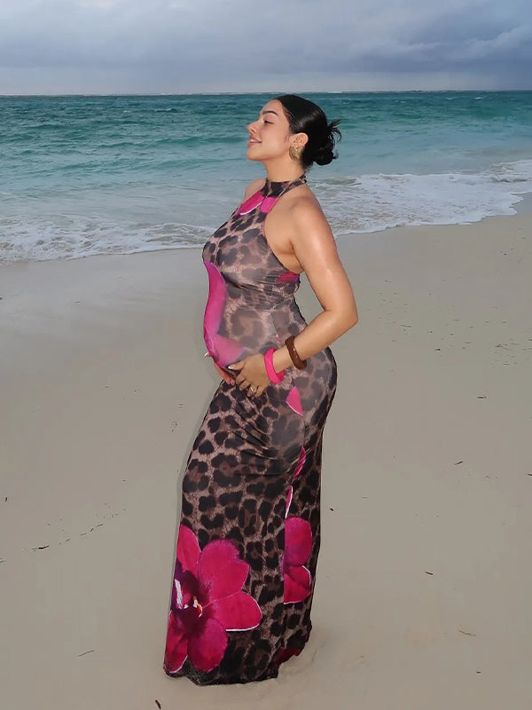 Momyknows Leopard Flowers Backless Photoshoot Maternity Maxi Dress