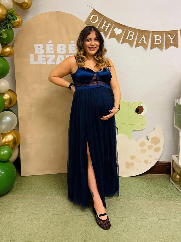 Momyknows Navy Blue Tulle Side Slit Sheer Baby Shower Maternity Maxi Dress