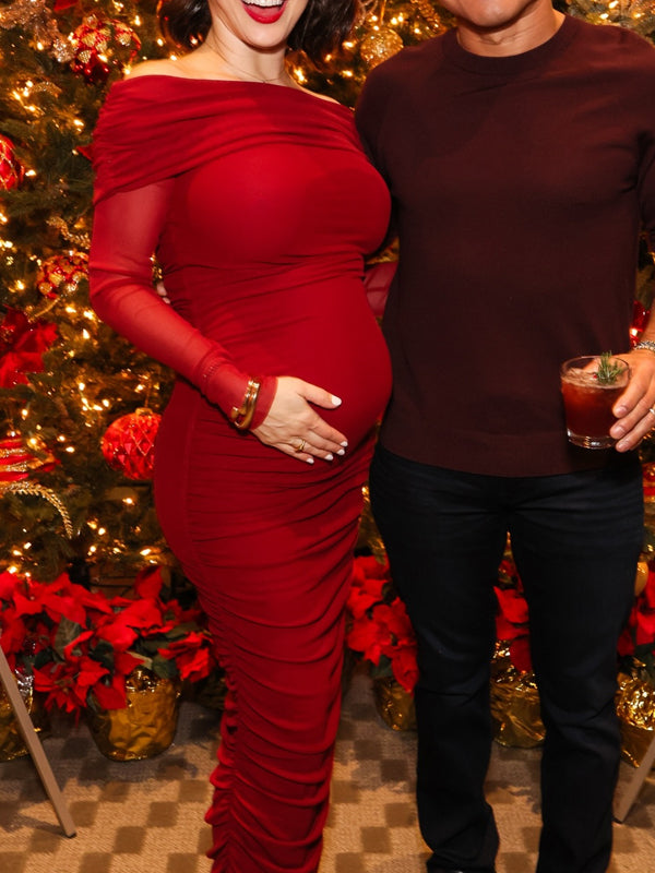 Momyknows Red Off Shoulder Ruched Sheer Maternity Baby Shower Maxi Dress