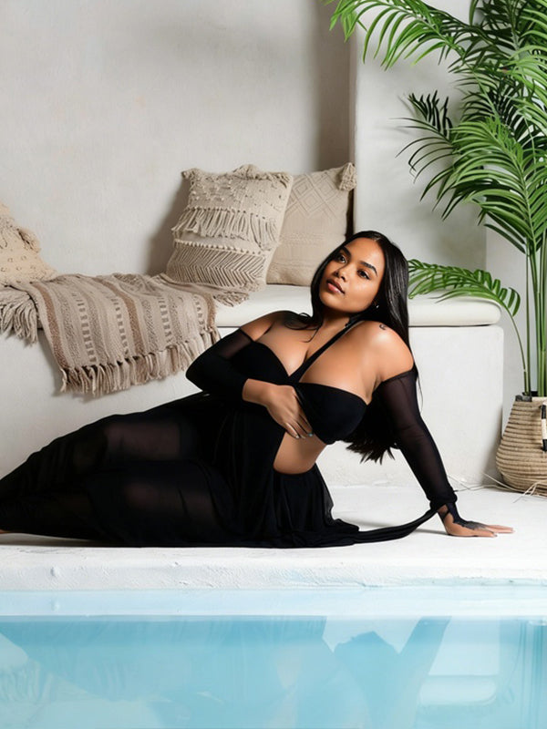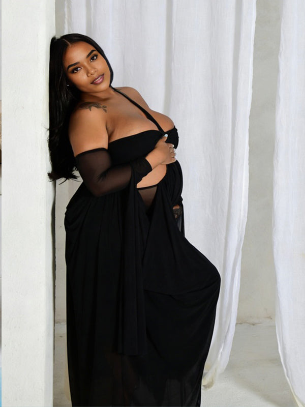 Momyknows Black Off Shoulder Sheer Slit Sleeve Maternity Photoshoot Maxi Dress