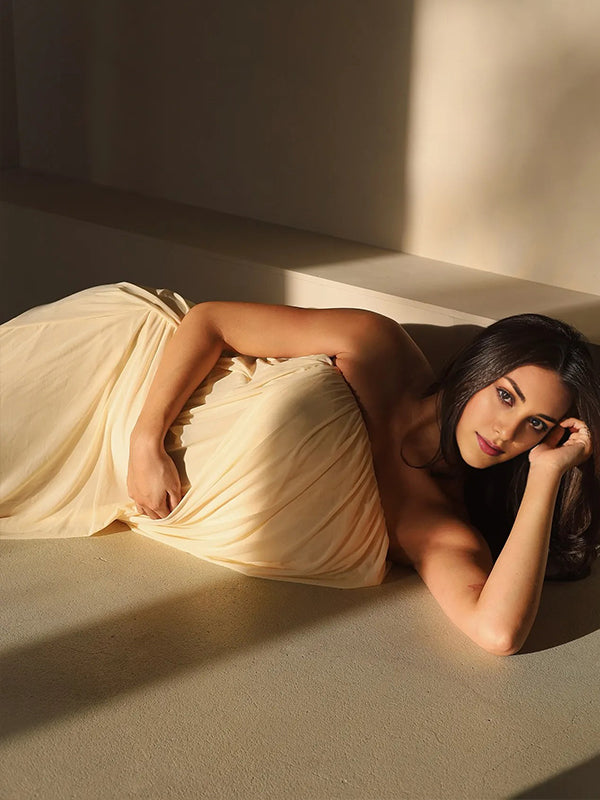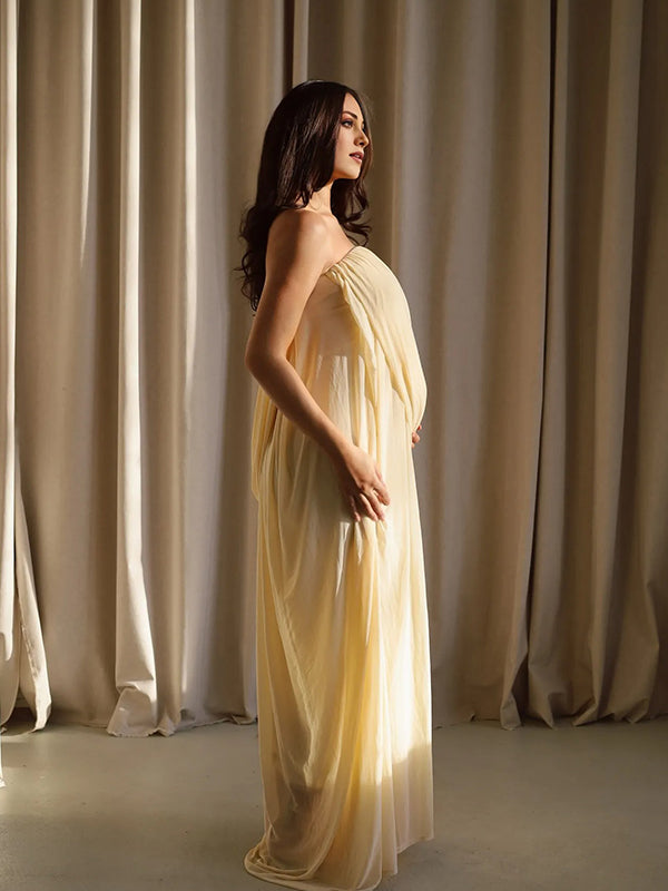 Momyknows Cream Mesh Ruched Irregular Bandeau Draped Maternity Maxi Dress