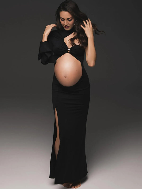 Momyknows Irregular One Shoulder Cut Out Crop Metal Buckle Side Slit Maternity Maxi Dress
