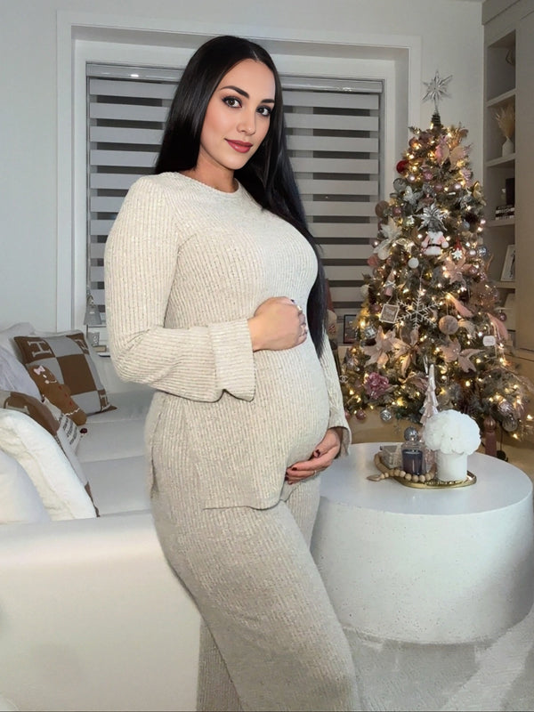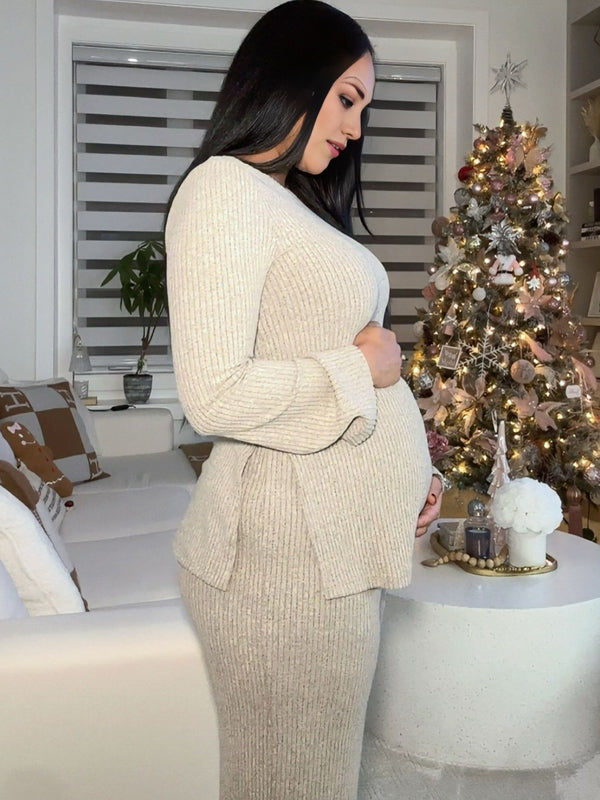 Momyknows Khaki Side Slit Crochet Two Piece Maternity Photoshoot Suit