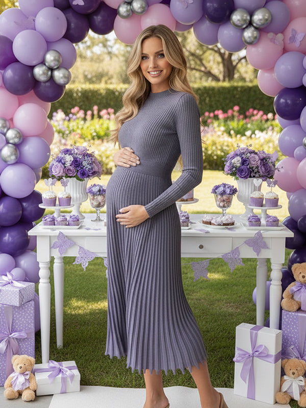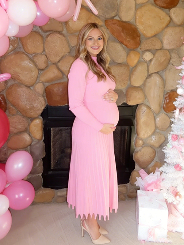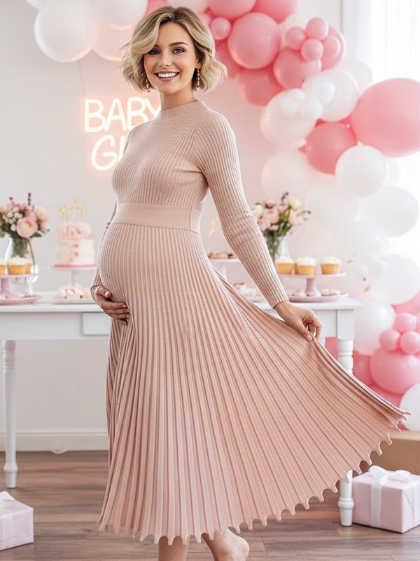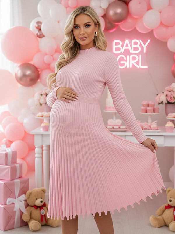 Momyknows Knit Pleated Big Swing High Neck Maternity Midi Sweater Dress