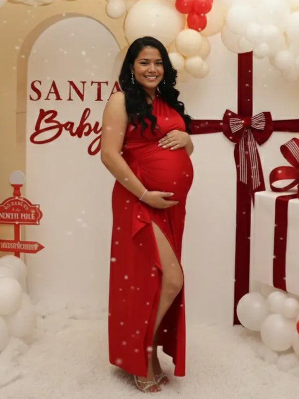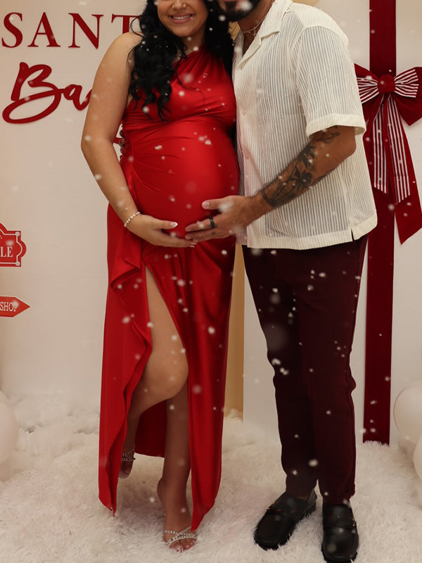 Momyknows Red Satin One Shoulder Ruched Ruffle Side Slit Backless Maternity Maxi Dress