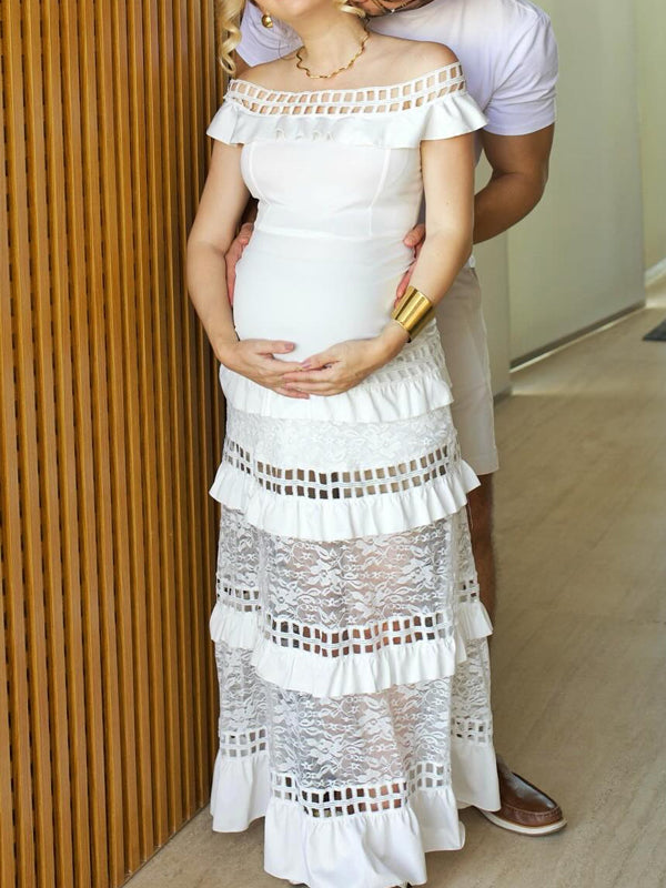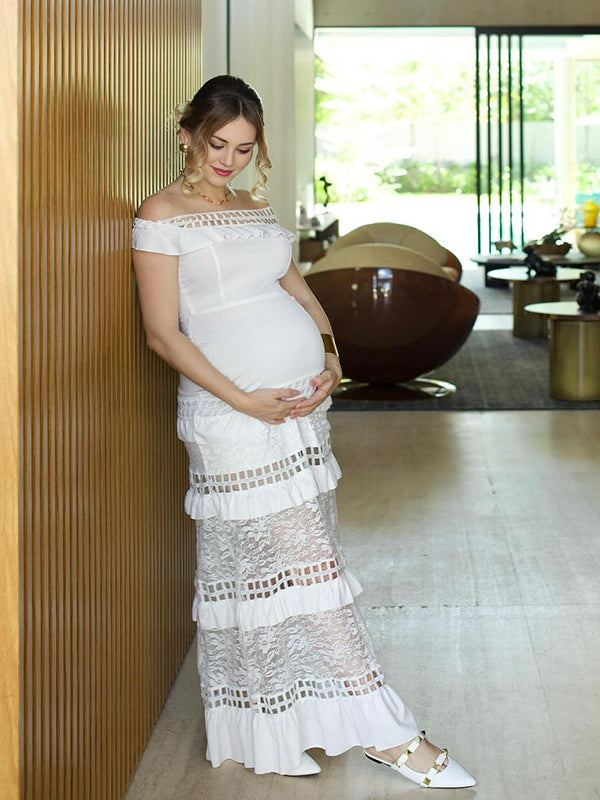 Momyknows White Ruffl Lace Off Shoulder Falbala Maternity Photoshoot Maxi Dress