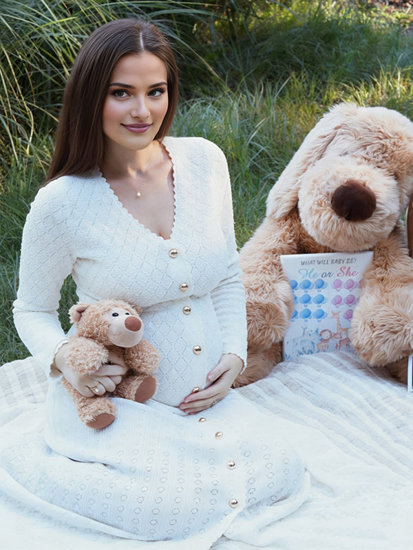 Momyknows White Single Breasted Crochet Pocket Maternity Sweater Photoshoot Maxi Dress