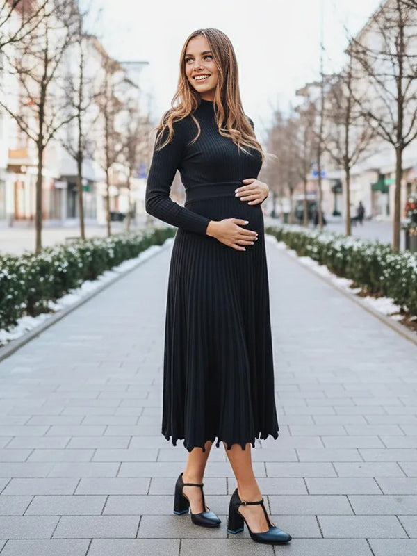 Momyknows Knit Pleated Big Swing High Neck Maternity Midi Sweater Dress