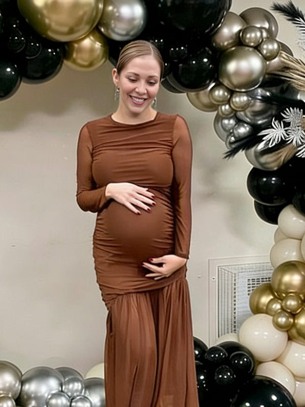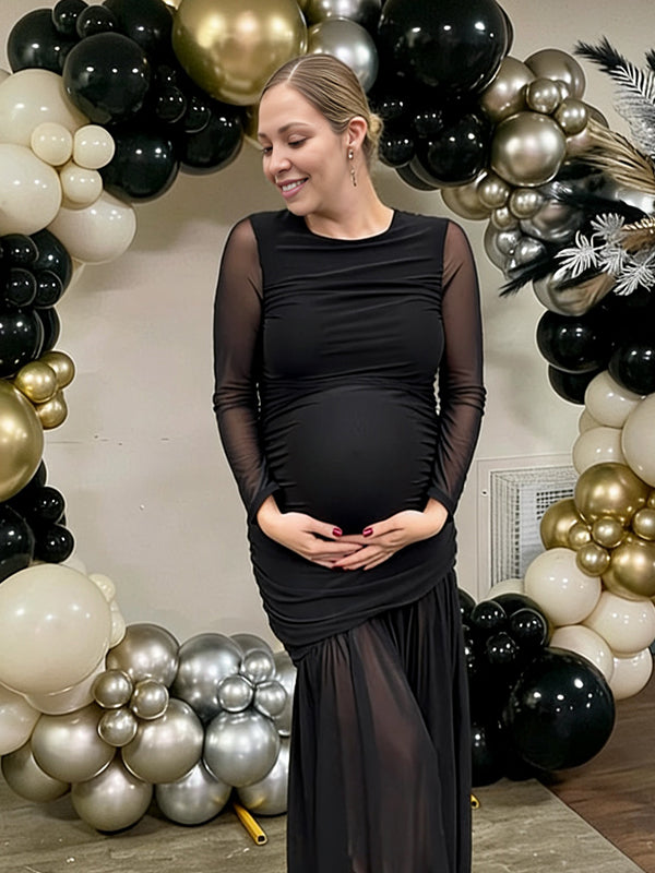 Momyknows Mesh Ruched Mermaid Sheer Maternity Baby Shower Maxi Dress