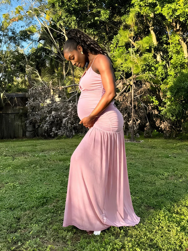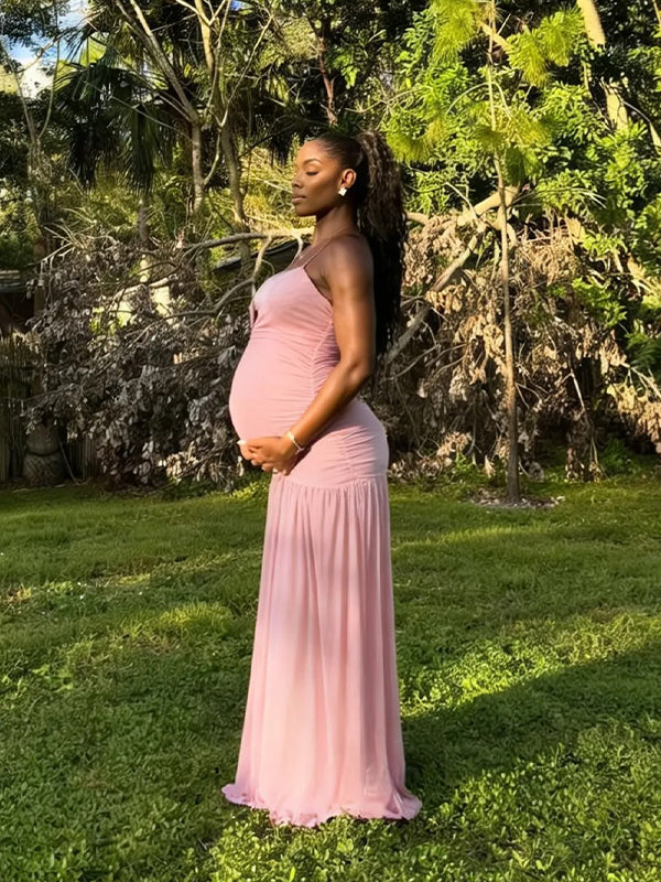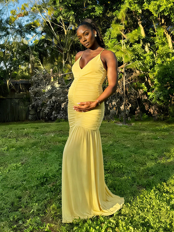Momyknows Ruched Grenadine Sheer Backless Photoshoot Maternity Maxi Dress