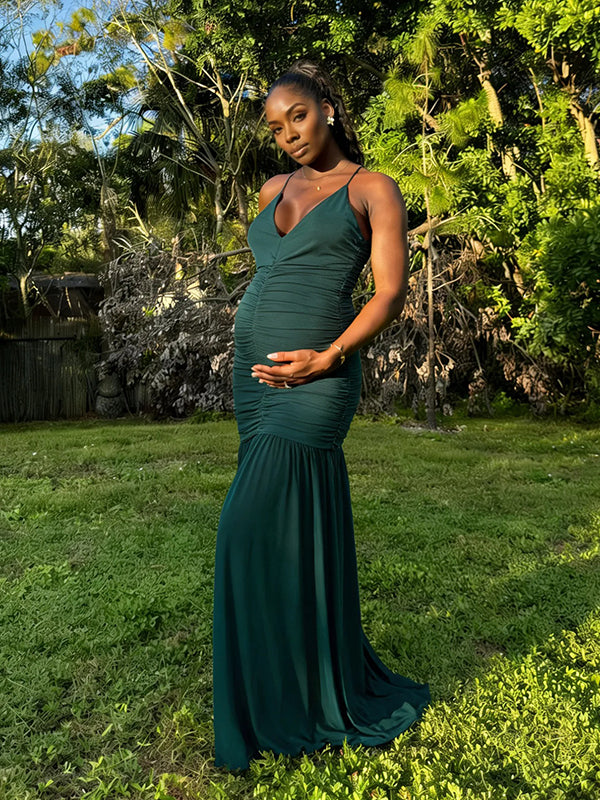 Momyknows Green Halter Neck Zipper Ruched Maternity Photoshoot Maxi Dress