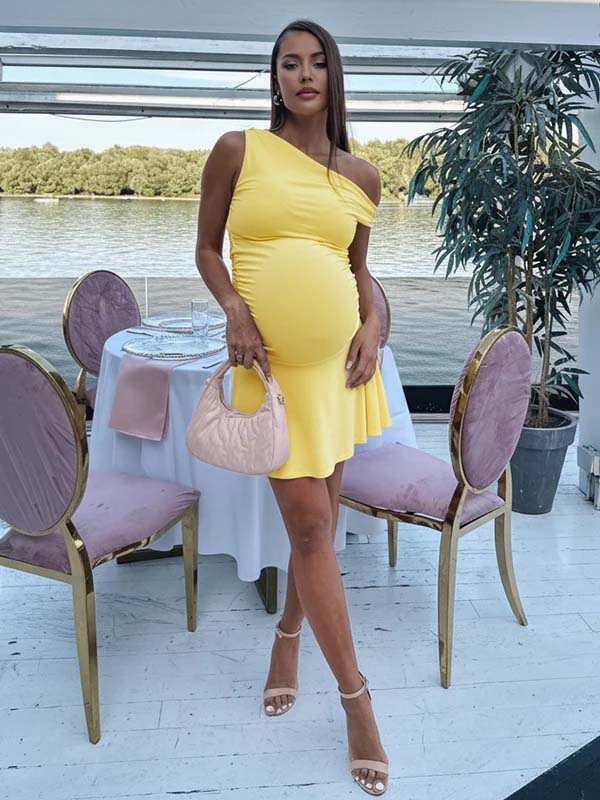 Momyknows Yellow One Shoulder Ruched Ruffle A-line Maternity Mini Dress
