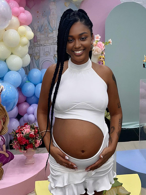 Momyknows White Halter Neck Backless Crop Maternity Baby Shower Mini Dress