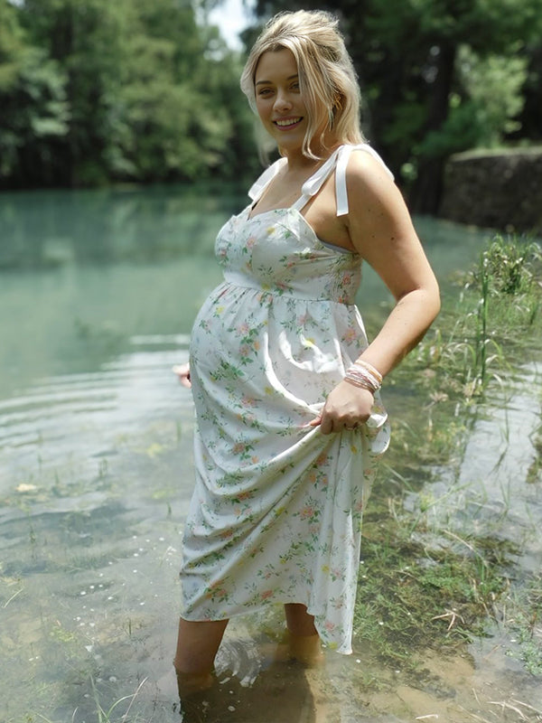 Momyknows White Floral Bodice Smocked Tie Shoulder Strap A-line Maternity Maxi Dress