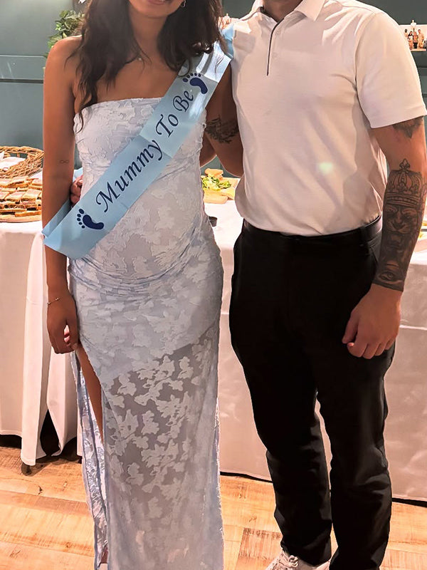 Momyknows Blue Lace Mesh Off Shoulder Knot Ruched Draped Sheer Maternity Maxi Dress