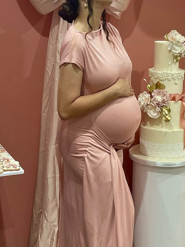 Momyknows Pink Ruched Draped Backless Baby Girl Shower Maternity Maxi Dress