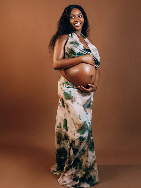 Momyknows Printed Ruched Crop Backless Two Piece Set Maternity Maxi Dress