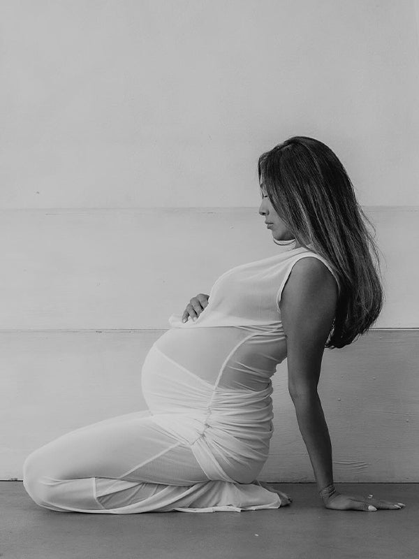 Momyknows Ruched Backless Sheer Photoshoot Maternity Maxi Dress