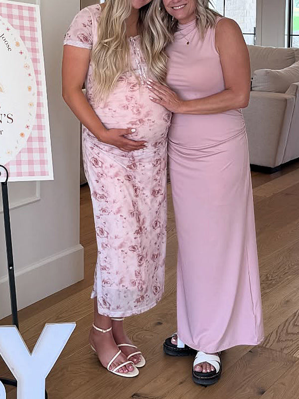 Momyknows Pink Floral Tie Baby Girl Shower Maternity Maxi Dress