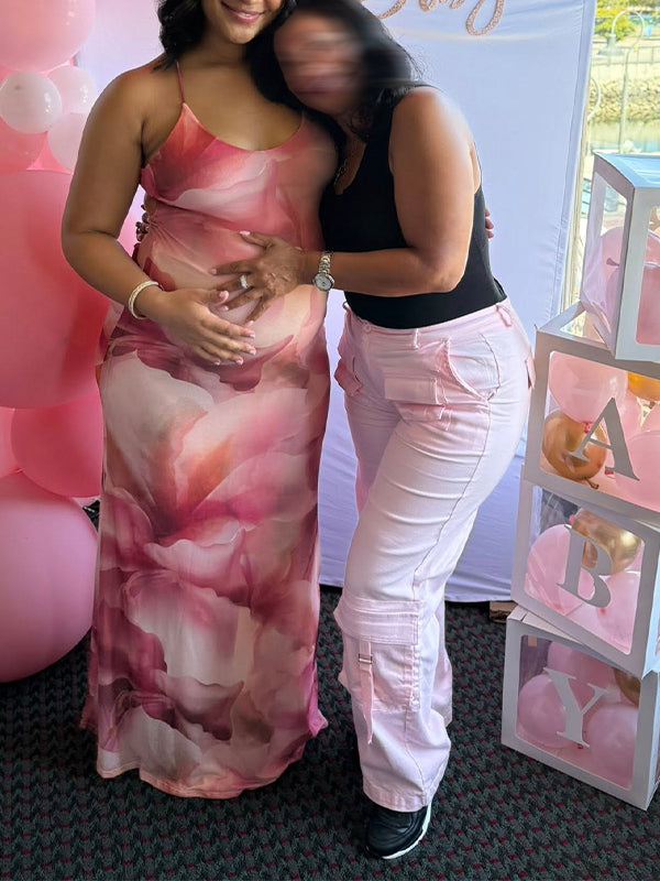 Momyknows Pink Flowers Backless Tie Baby Shower Maternity Maxi Dress