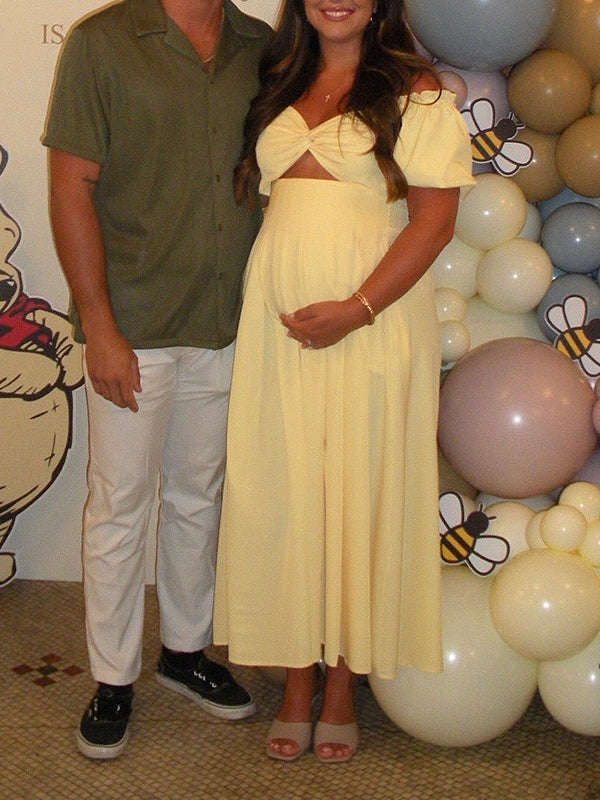 Momyknows Yellow Twist Cut Out Smocked Baby Shower Maternity Maxi Dress