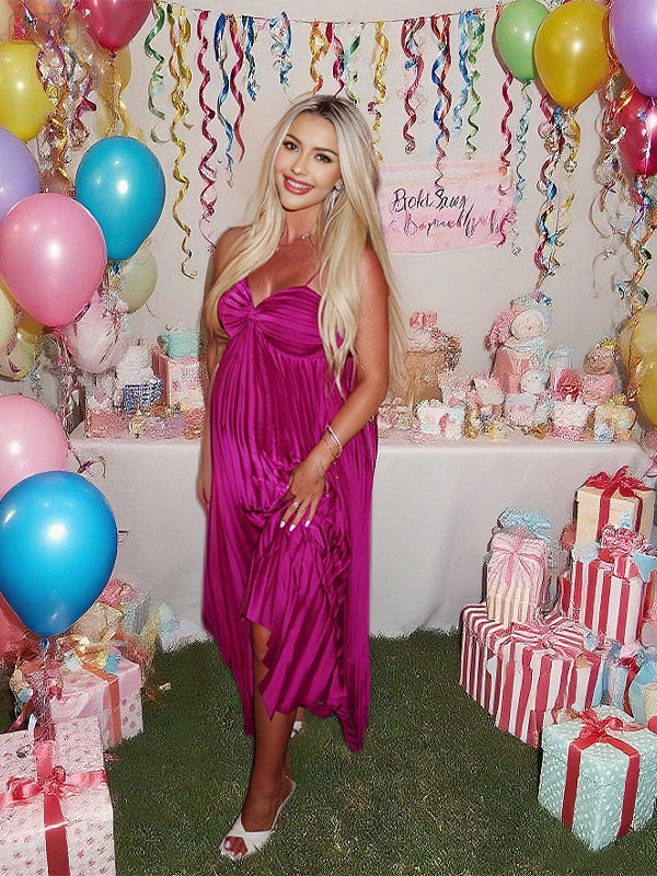 Momyknows Rose Carmine Pleated Irregular Baby Shower Maternity Maxi Dress