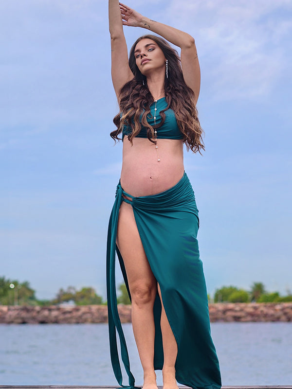 Momyknows Green Side Slit Irregular Lace Up Two Piece Maternity Photoshoo Maxi Dress