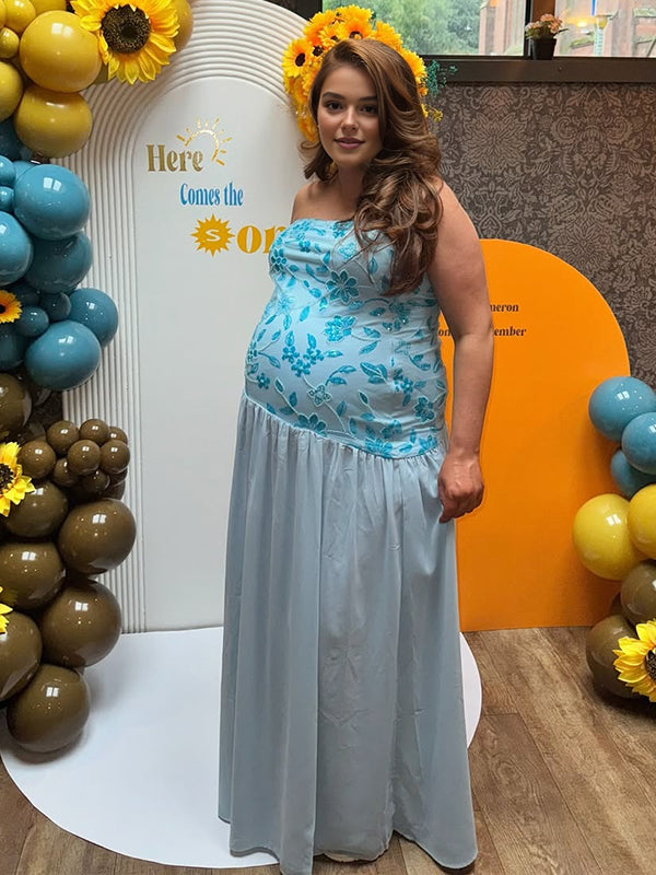 Momyknows Bandeau Floral Strapless Beaded Side Slit Maternity Maxi Dress