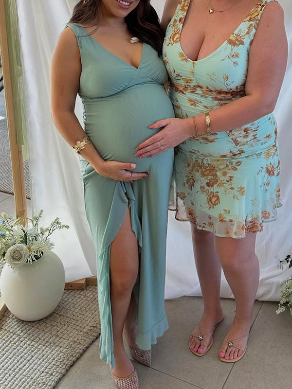 Momyknows Green Ruffle Side Slit V-neck Maternity Maxi Dress