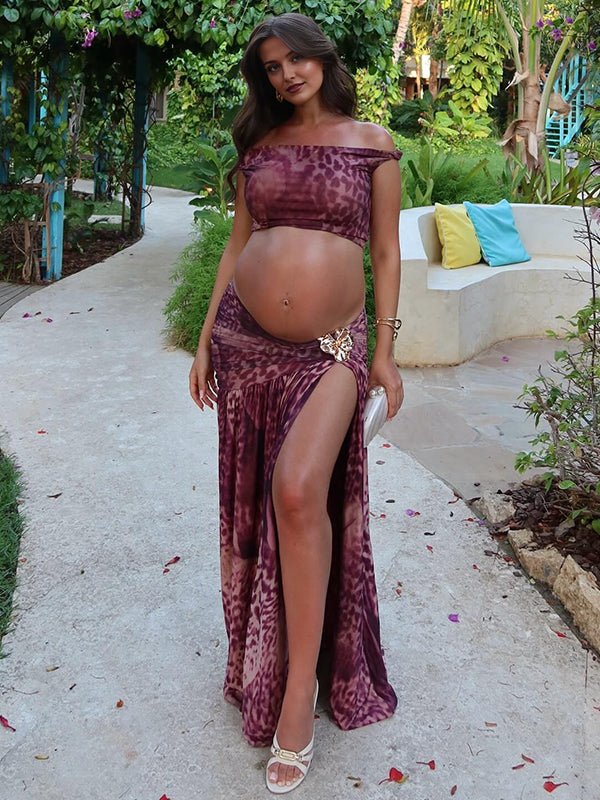 Momyknows Printed Off Shoulder Crop Mental Buckle Ruched Side Slit Maternity Maxi Dress