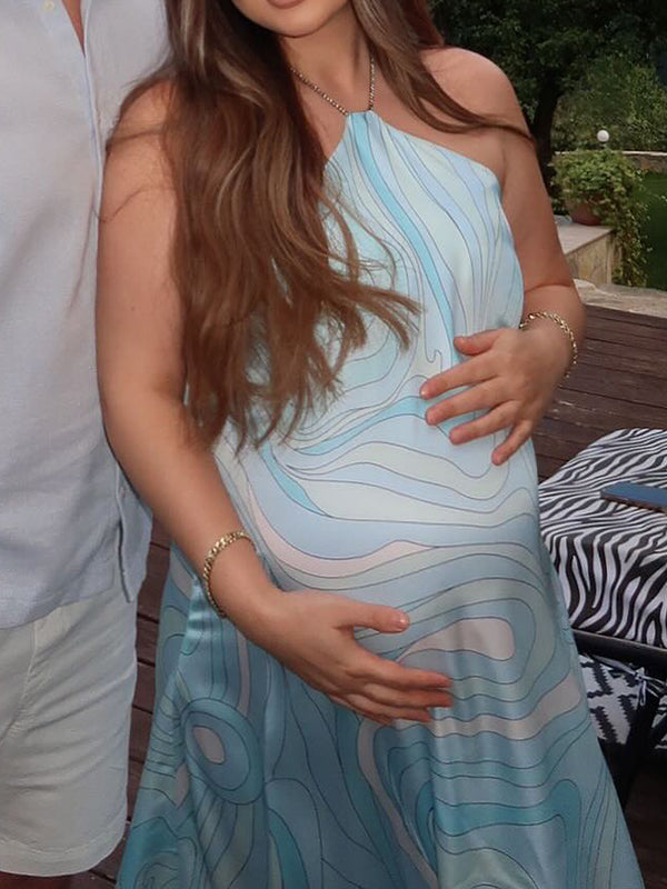 Momyknows Blue Printed Irregular Rhinestone Strap Halter Neck Backless Maternity Maxi Dress