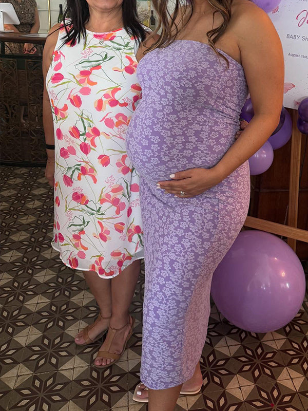 Momyknows Violet Floral Bandeau Ruched Strapless Bodycon Maternity Maxi Dress