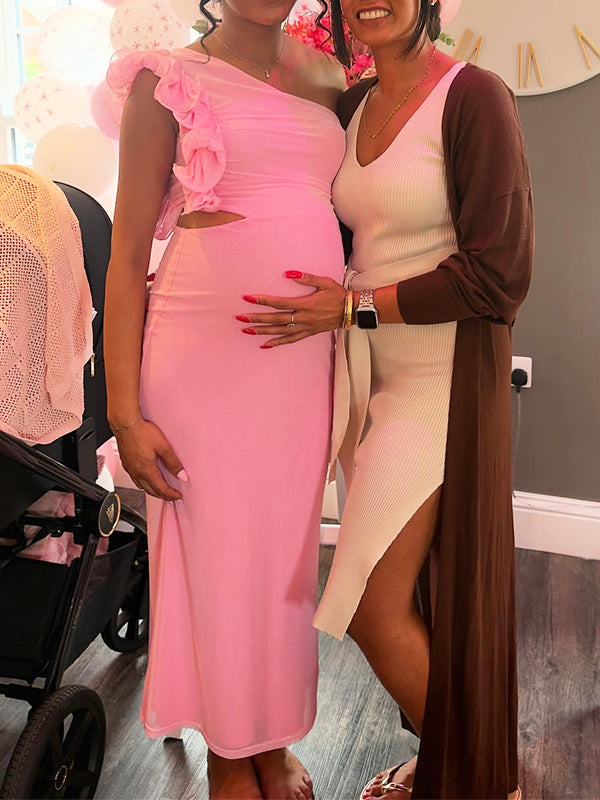 Momyknows Pink Ruffle One Shoulder Cut Out Baby Girl Shower Maternity Maxi Dress