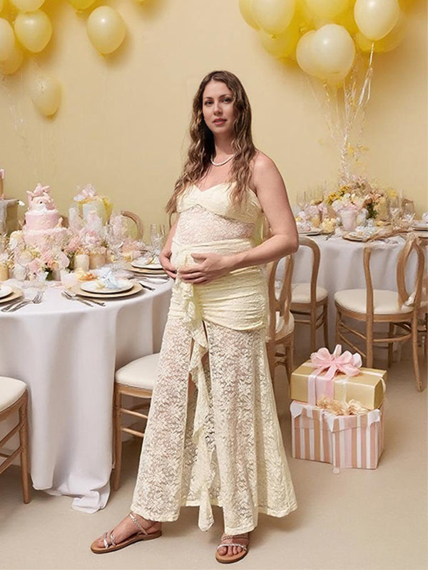 Momyknows Light Yellow Lace Ruffle Slit Sheer Baby Shower Maternity Maxi Dress