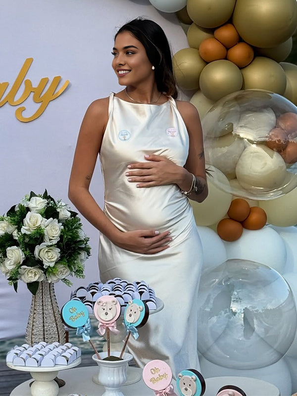 Momyknows Nude Silk Twist Ruched Baby Shower Maternity Maxi Dress