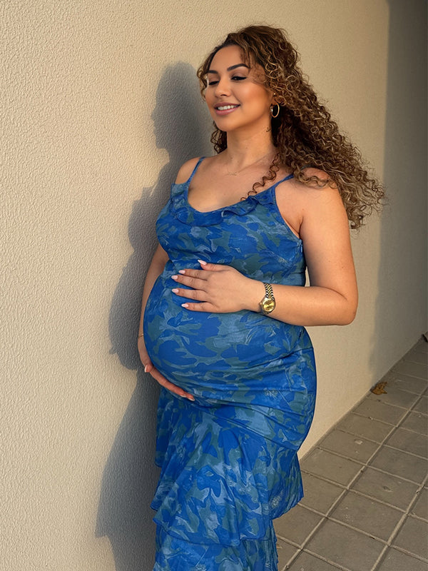 Momyknows Blue Floral Cake Ruffle Mermaid Maternity Maxi Dress