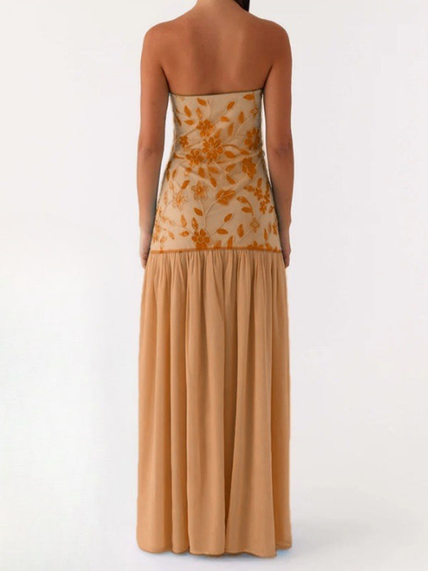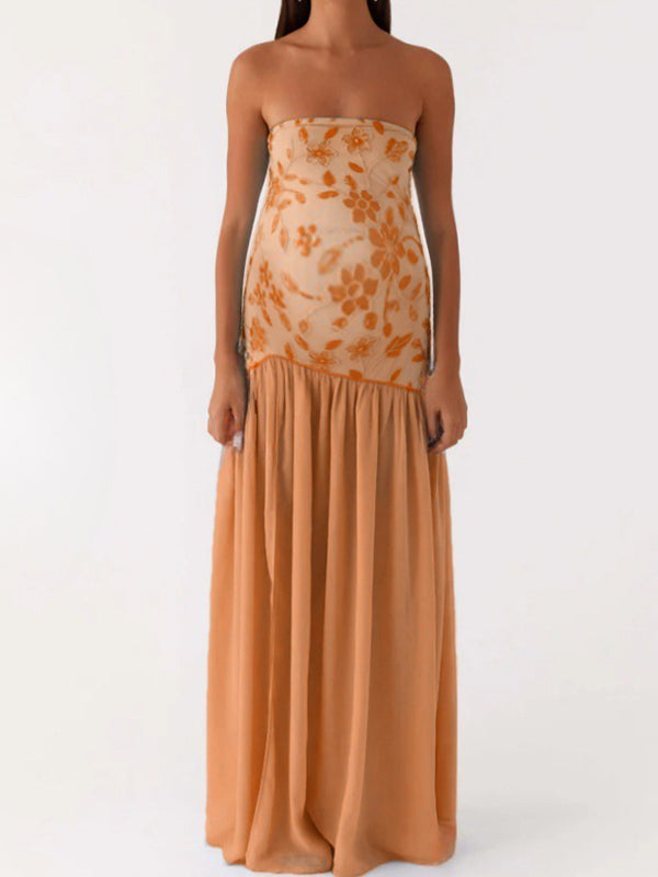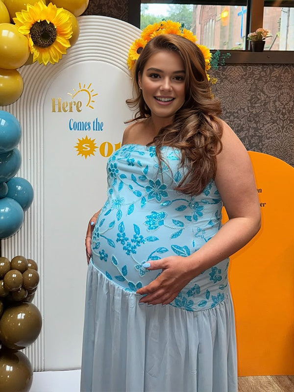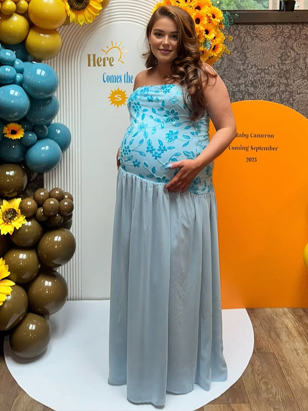 Momyknows Bandeau Floral Strapless Beaded Side Slit Maternity Maxi Dress