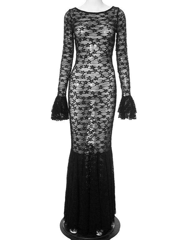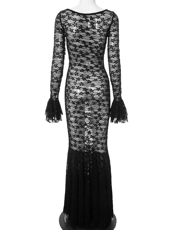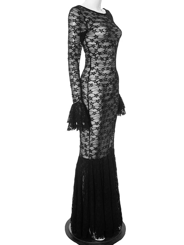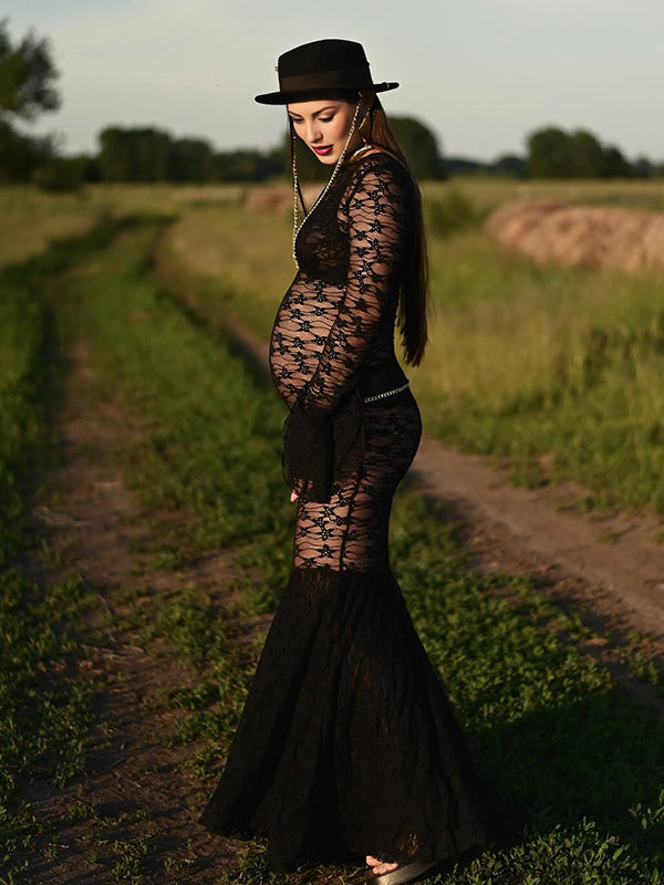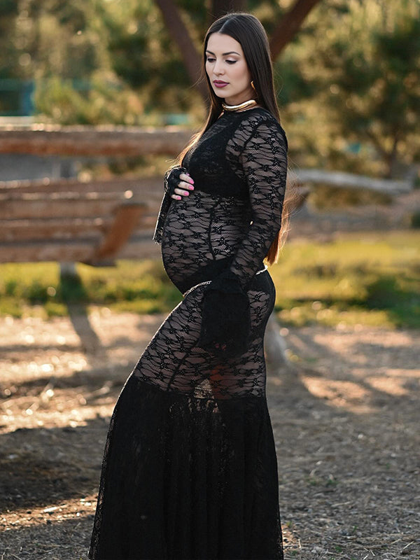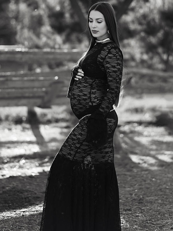 Momyknows Black Lace Ruffle Flare Sleeve Mermaid Sheer Maternity Maxi Dress