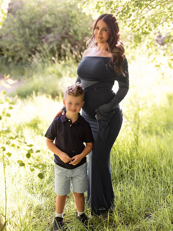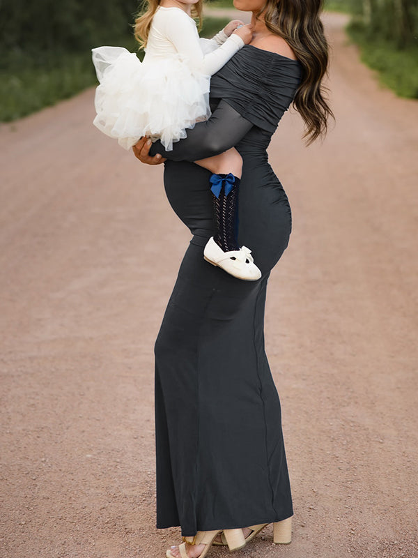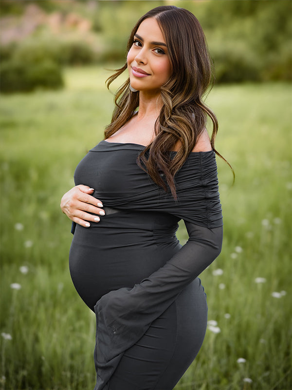 Momyknows Black Off Shoulder Ruched Mesh Mermaid Maternity Maxi Dress