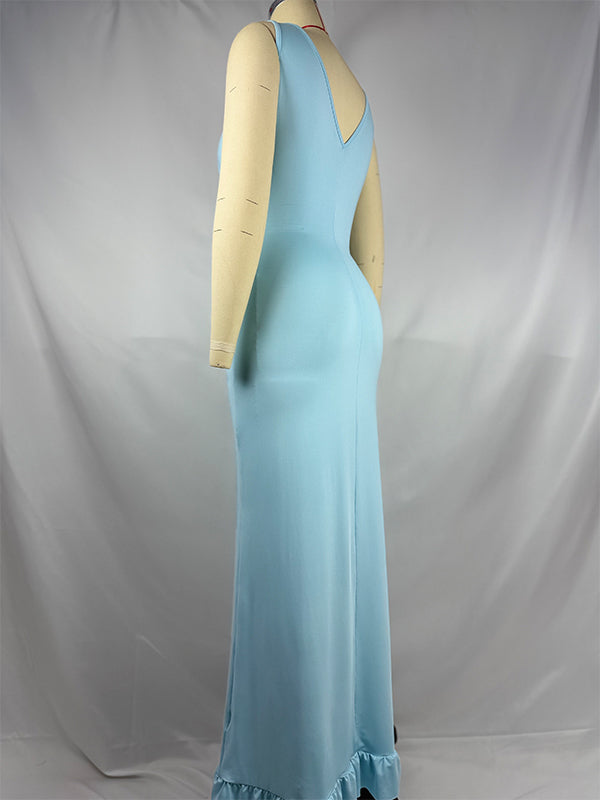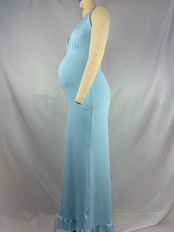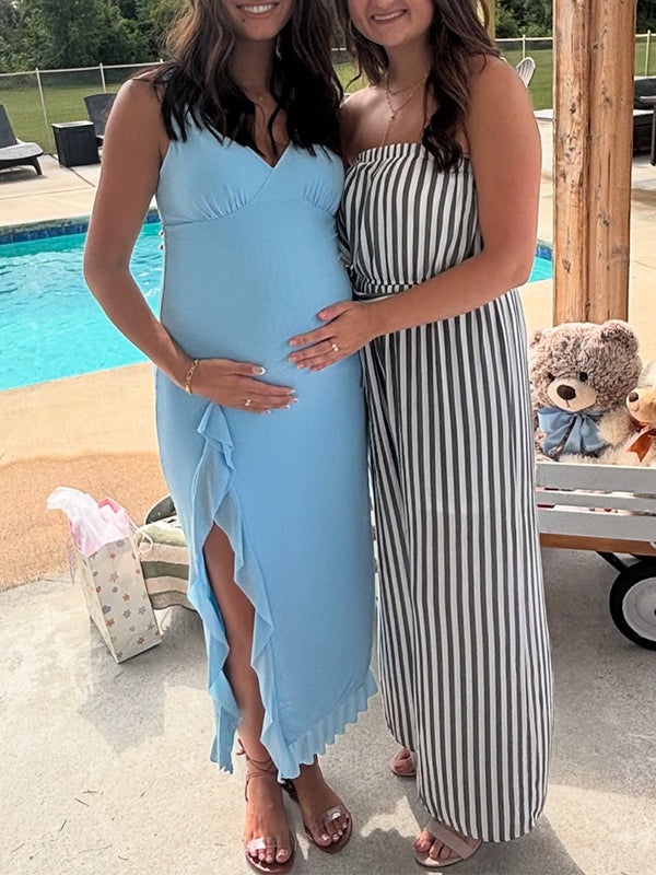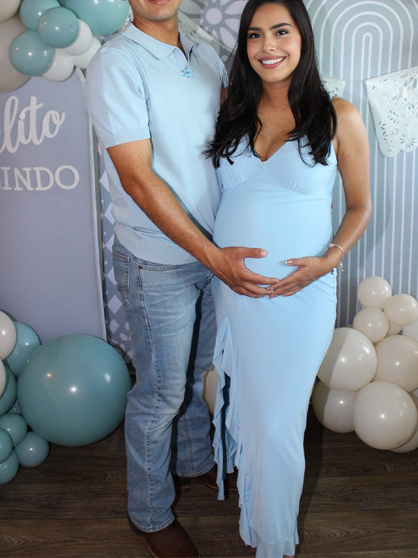 Momyknows Blue Ruffle Side Slit Baby Boy Shower Maternity Maxi Dress