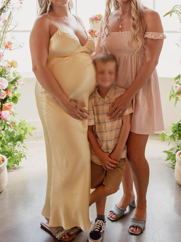 Momyknows Light Yellow Spaghetti Strap Lace-up Maternity Baby Shower Maxi Dress